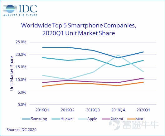 依靠红米,小米占据核心性价比用户群体,全年出货量总计1.25亿台,国内和全球市场份额均排名第四,与之相匹配的是,公司股价在此阶段开始触底企稳并在2019年底酝酿上升之势。
