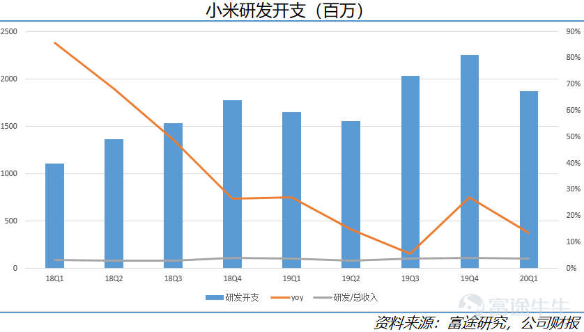 除了清库存,小米2019年还在大力搞研发,不断打磨产品,冲击高端领域。2019年公司研发投入75亿元,预计2020年还将超过100亿元,近4年来研发投入复合增长率达53%。