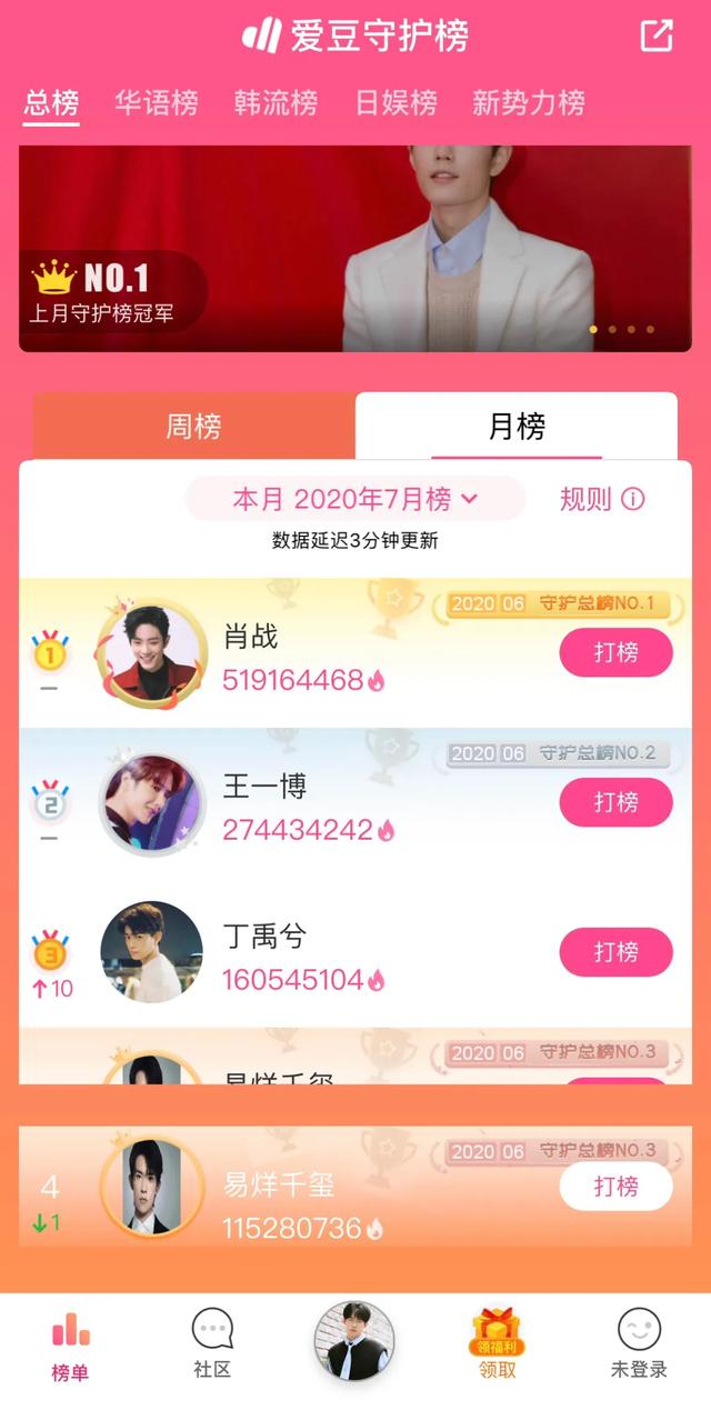爱豆APP的第一个Tab就是「爱豆守护榜」。截止目前,六月守护总榜第一的肖战获得了519164468的守护值,与第二名王一博拉开了极大的差距。