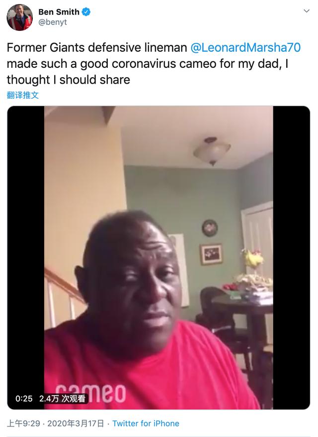 父母怎么说都不听?《纽约时报》媒体专栏作家Ben Smith就给前巨人队中后卫Leonard Marsha下了一单,以此来说服他的父亲支棱起来,多多重视预防新冠肺炎。