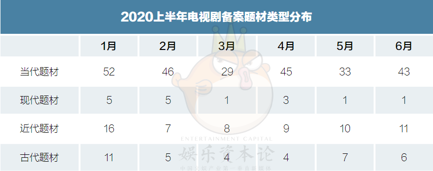 除当代都市题材之外,其他种类的电视剧备案则数量寥寥。主要是因为与当代剧相比,近代、古代剧集的拍摄难度更大,且投资成本高、收益周期长,故影视公司在非当代题材类型的选择上则会更加的谨慎。