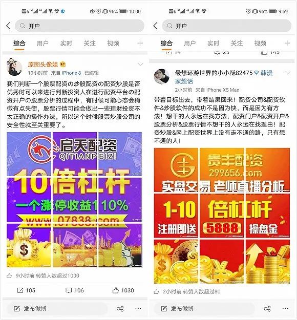 拥有一个证券账户,往往是新股民的第一步操作。如果在微博上搜索“开户”,就会出现配资平台们的广告。图片中最为清晰的就是平台名称、网站和“10倍杠杆”这样的字眼,而且还有“注册即送5888操盘金”的新人活动。