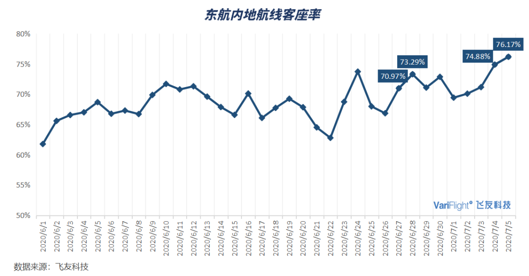 出行一客从飞友科技了解到,东航推出“周末随心飞”套餐后的首2个周末(6月27日-28日及7月4日-5日),内地航线客座率有明显提振,首2个周末平均客座率约达74%。作为“周末随心飞”的热门进出港城市,上海和成都的机场起降架次也在上述2个周末呈现上升态势,其中7月5日上海虹桥机场和成都双流机场起降架次均恢复到去年同期约9成的水平。