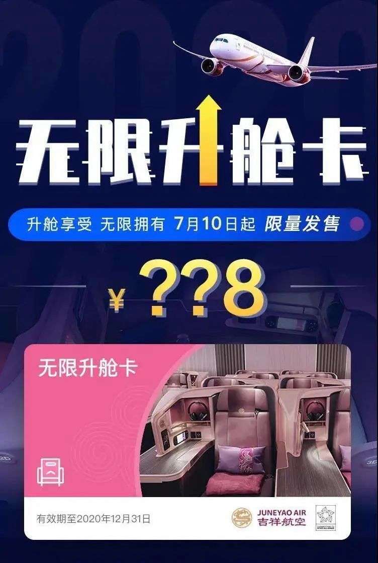 吉祥航空则推出了“无限升舱卡”,用户以三位数的价格,可以在吉祥航空实际承运的所有国内(含港澳台地区)航线,享受不限次数升舱服务。该产品将于7月10日起售,细则尚未公布。