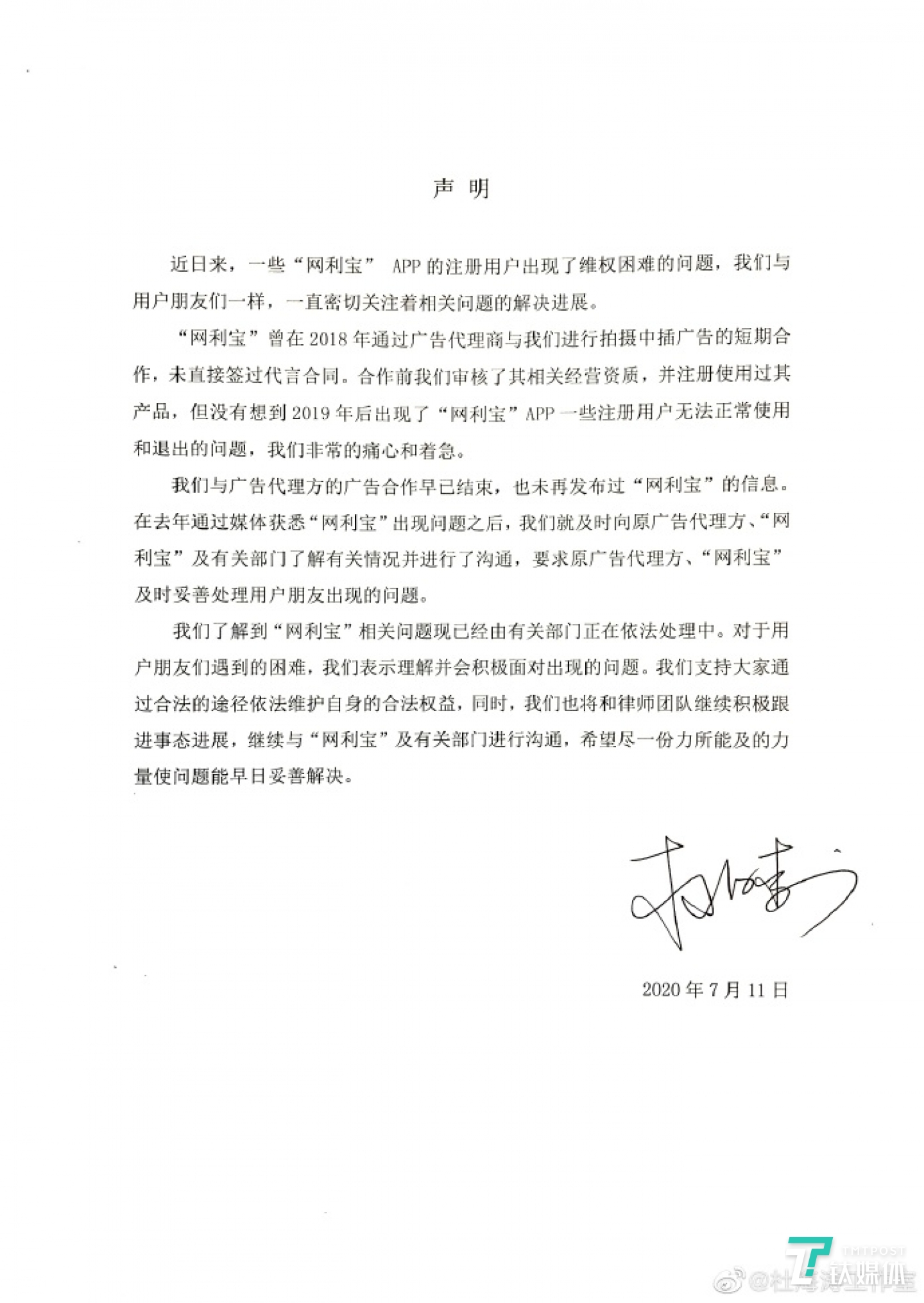 对于网利宝App出现的问题,杜海涛工作室此前已与原广告代理方、网利宝及有关部门进行沟通,后续将和律师团队继续积极跟进事态进展,使问题早日妥善解决。