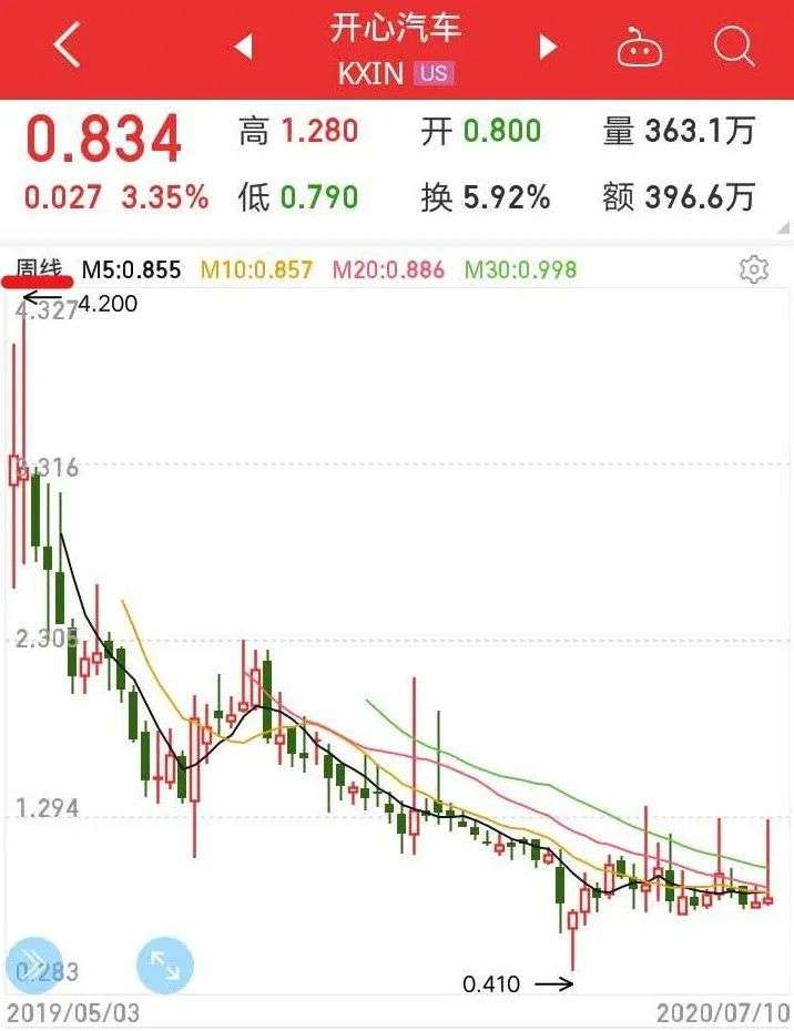 2019年5月2日,开心汽车股票上市交易,开盘价为3.19美元。当年5月6日,股价上冲至4.200美元。之后,步入了漫漫熊途。