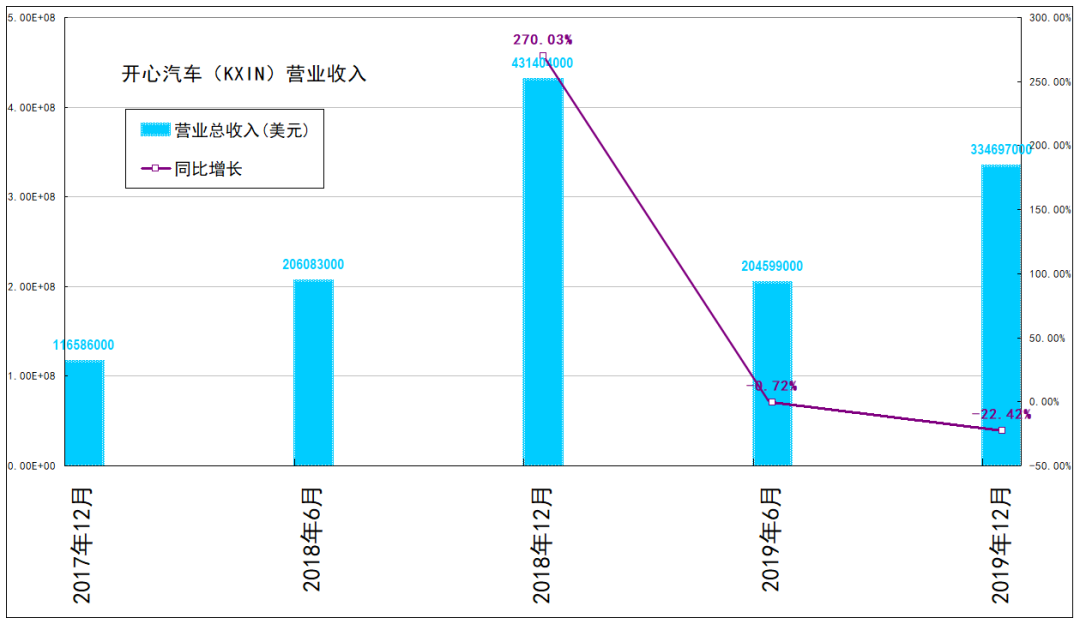 2019年,开心汽车的总净营收为3.35亿美元,同比下降22.42%。而2018年,总净营收为4.31亿美元,同比增长270.03%。