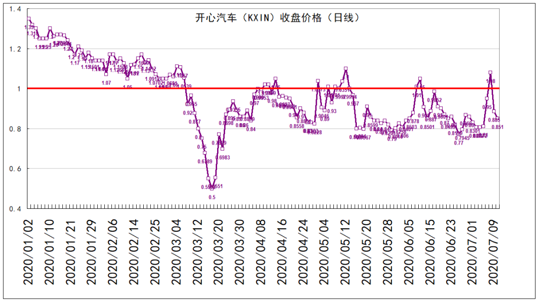 截至美东时间7月10日,开心汽车总市值为5116.83万美元,股价仍然低于1美元,报收于0.834美元,命悬一线。