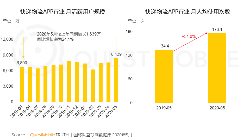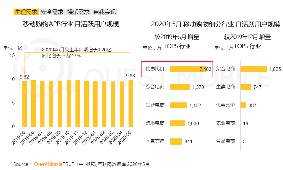 疫情影响下,这半年多,宅经济从消费向学习、工作、生活延伸,依托人的需求层次,形成了非常明显的趋势。QuestMobile数据显示,2020年5月,线上购物(包括电商、外卖)已经整体恢复到了疫情前水平,优惠比价再次快速崛起,成为增长最快的电商应用(同比增加近2500万),生鲜电商月活用户同比增长21.9%,快递物流人均使用次数同比增长31%。