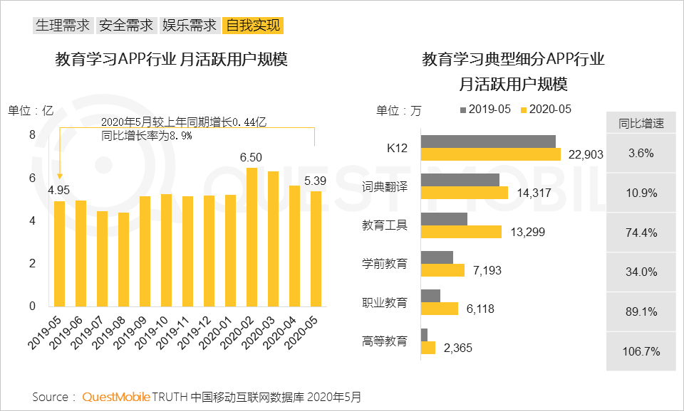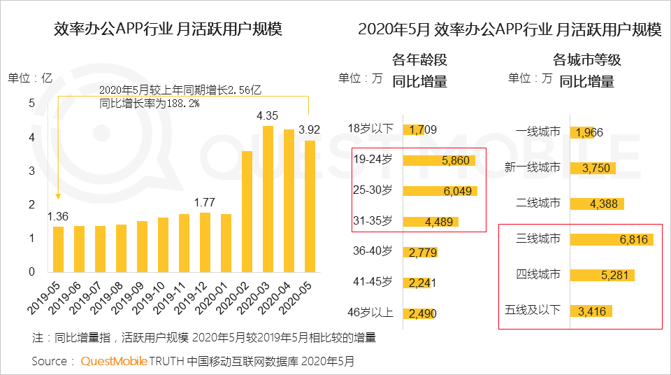 除了消费、生活,学习、工作也成了宅经济的核心部分。2020年5月,教育行业同比增长8.9%达到5.39亿(相比2月份最高峰下降了约1.1亿),未来是否会持续维持高位,可能与疫情发展情况密切相关。效率办公方面,与教育行业的走势相似,不过回落趋势更为缓慢,2020年5月,行业活跃用户同比增长188.2%,达到3.92亿(相比3月最高峰下降了约4000万),显然,线上办公黏性更高……