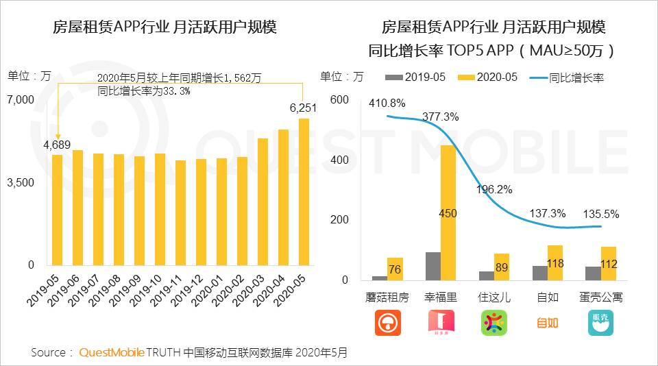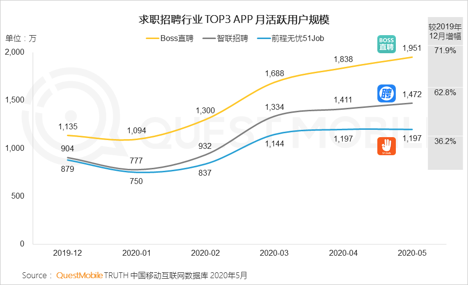 线上租房也成了一个新的爆发点,2020年5月,房屋租赁APP突破6200万,同比增长33.3%,其中,同比增速TOP 5 APP中,蘑菇租房、幸福里、住这儿、自如、蛋壳公寓分别同比增长410.8%、377.3%、196.2%、137.3%、135.5%。当然了,疫情之下,租赁行当面临相当艰难的局面,可能在赔本赚吆喝、与租客共克时艰,值得尊敬,同样值得尊敬的,还有最难就业季下的招聘行当,希望线上化能给大家更多助力。