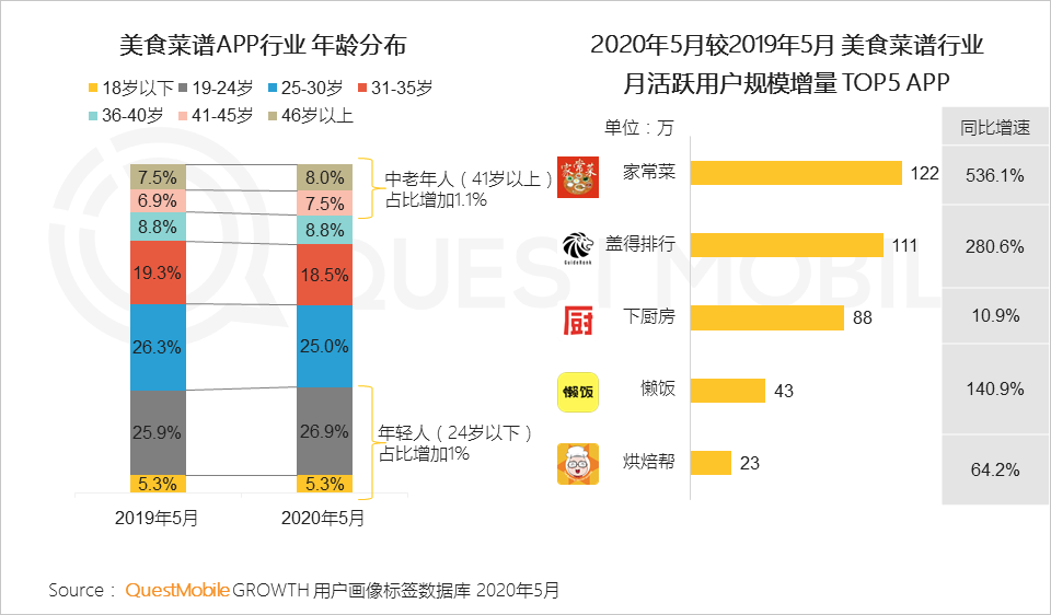 2.5 居家工作生活期间,无法外出就餐+空闲时间增加,自制餐食成为更多人的选择,年轻人有样学样,中老年人尝试新菜肴,推动美食菜谱类APP获得增长