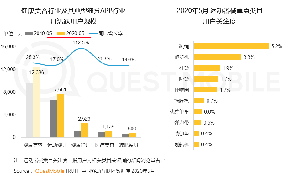 吃喝之上,线上问诊、居家健康管理、运动健身需求已经爆发。医疗服务行业整体月活在3000万左右,同比增速TOP 5 APP中,叮当快药、科瑞泰Q医、北京挂号网、丁香医生、健客网上药店分别同比增长190.9%、189.1%、182.8%、173.1%、154.4%。同时,居家运动健身、健康管理用户规模分别突破7600万、2500万。