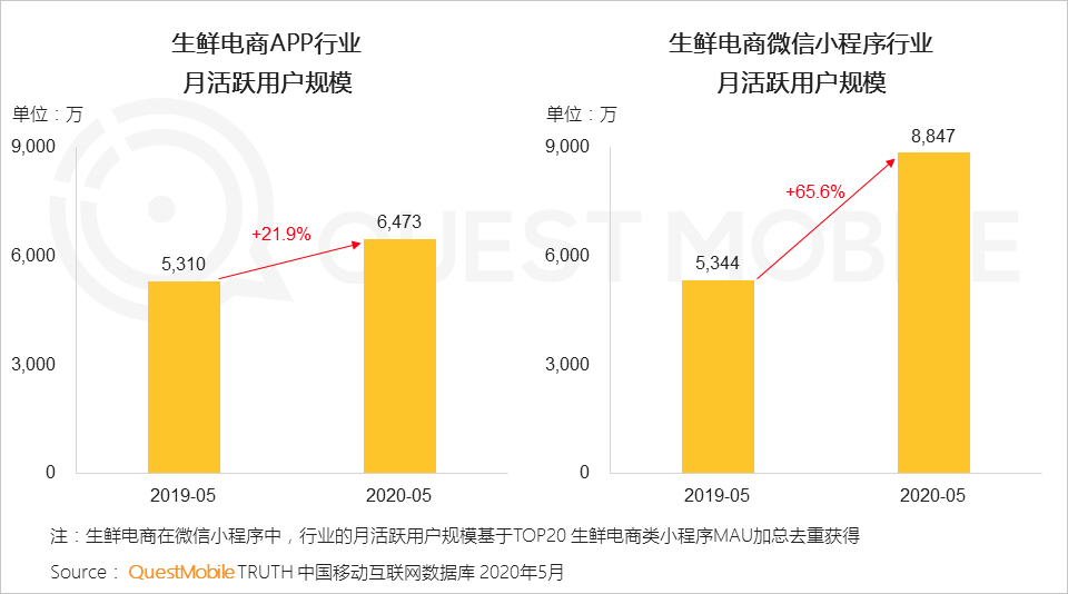2.4 民以食为天,生鲜电商大受青睐;通过社交亲友推荐,小程序成宅家在线逛菜场新宠,相比APP行业,用户规模与同比增速均更高