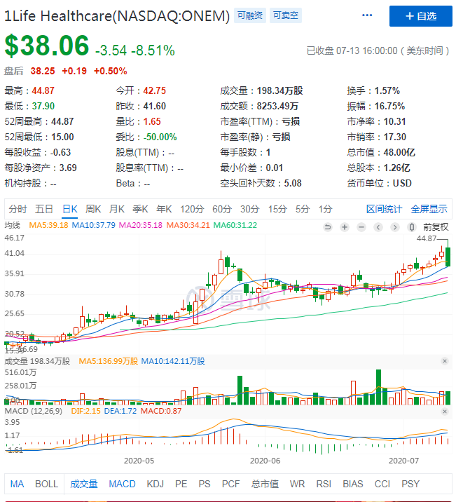 今年年初,全球新冠疫情肆虐,虽说各行各业受到不小的冲击,但在这轮危机中也存在一些机遇。其中医药板块多少股年内翻翻,尤其是生物医药和创新药领域不少企业乘势大涨,1Life Healthcare这家公司就是典型获益者。截至目前,1Life Healthcare股价为38.06美元,市值为48亿美元。