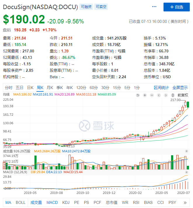 自3月份低点以来,DocuSign的股价已上涨超200%。因股价持续表现较良好,纳斯达克方面宣布DocuSign将取代美联航空成为纳斯达克100指数成分股,于6月22日正式加入该指数。截至目前,DocuSign股价为190.02美元,市值为348.70亿美元,在疫情期间借电子签名实现股价跟市值的双增长。