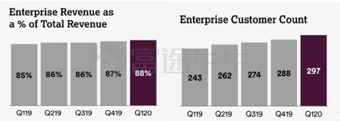 由于云计算能力突出,这也让Fastly成为最著名的「实时CDN」。根据财报来看,企业客户是Fastly的主要收入来源和增长动力。在FY2020Q1中,有88%的收入是来自于企业客户,这一比例在过去五个季度中呈稳定增长的趋势。与此同时,企业客户数量也从去年同期的243家增长到297家。