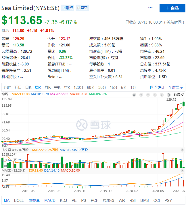 今年以来的全球公共卫生危机中,电商股受益最甚,并且一直独占鳌头。除了亚马逊、Shopify、阿里巴巴之外,Sea Limited也在这次疫情期间表现出很强的增长势头。今年上半年以来,Sea Limited股价累计涨幅达到182%。截至目前,Sea Limited股价为113.65美元,市值为537.54亿美元。