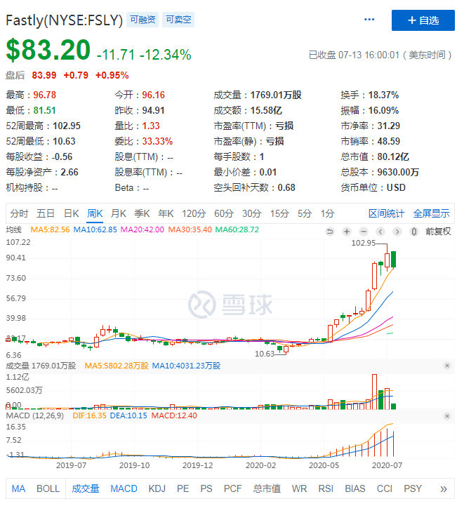 Fastly是一家基础设施软件和服务提供商,提供的服务包括云计算、图像优化、安全性、边缘计算机技术和流媒体解决方案。截至目前,Fastly股价为83.20美元,市值为80.12亿美元。今年上半年以来,这家公司的股价已经上涨超300%。