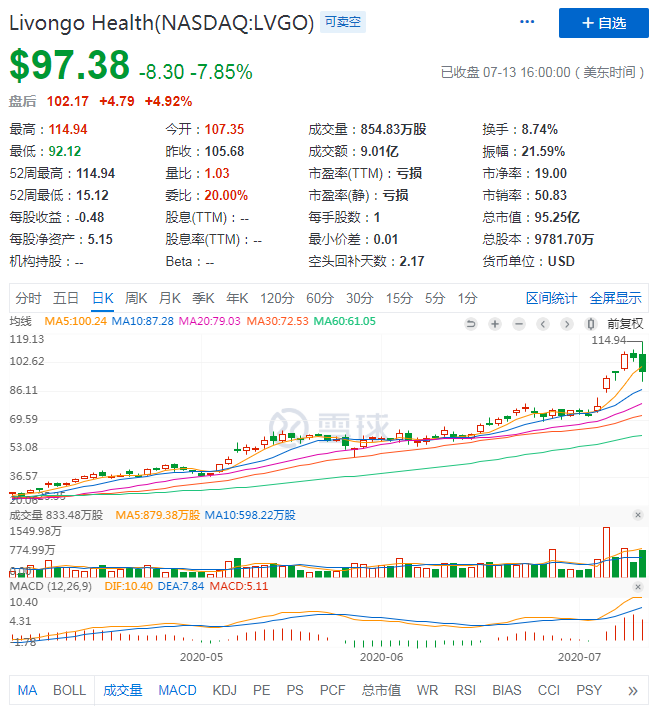 在疫情期间,不少医疗保健股的表现都很强势。在今年上半年,Livongo Health股价涨幅超过300%。截至目前,Livongo股价为97.38美元,市值为95.25亿美元。
