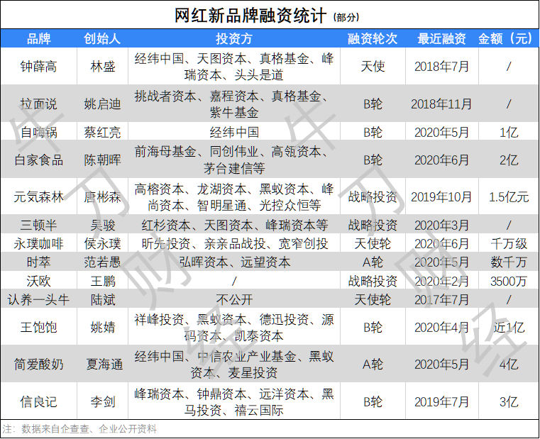 拉面说最近的一笔融资是2018年11月,投资方有真格基金、紫牛基金等;网红饮料元気森林最近的一笔融资,则是2019年10月来自高榕资本、龙湖资本、黑蚁资本。