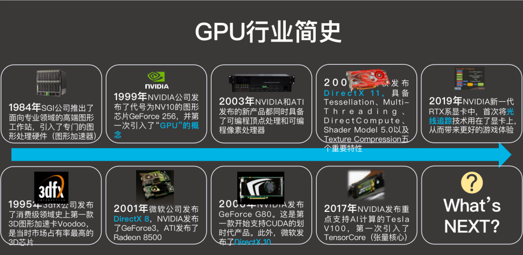 从1984年SGI公司推出了面向专业领域的高端图形工作站,引入了专门的图形处理硬件(图形加速器),到2019年NVIDIA新一代RTX系显卡中,首次将光线追踪技术用在了显卡上。GPU领域迅猛发展,也为用户带来了更好的游戏体验。