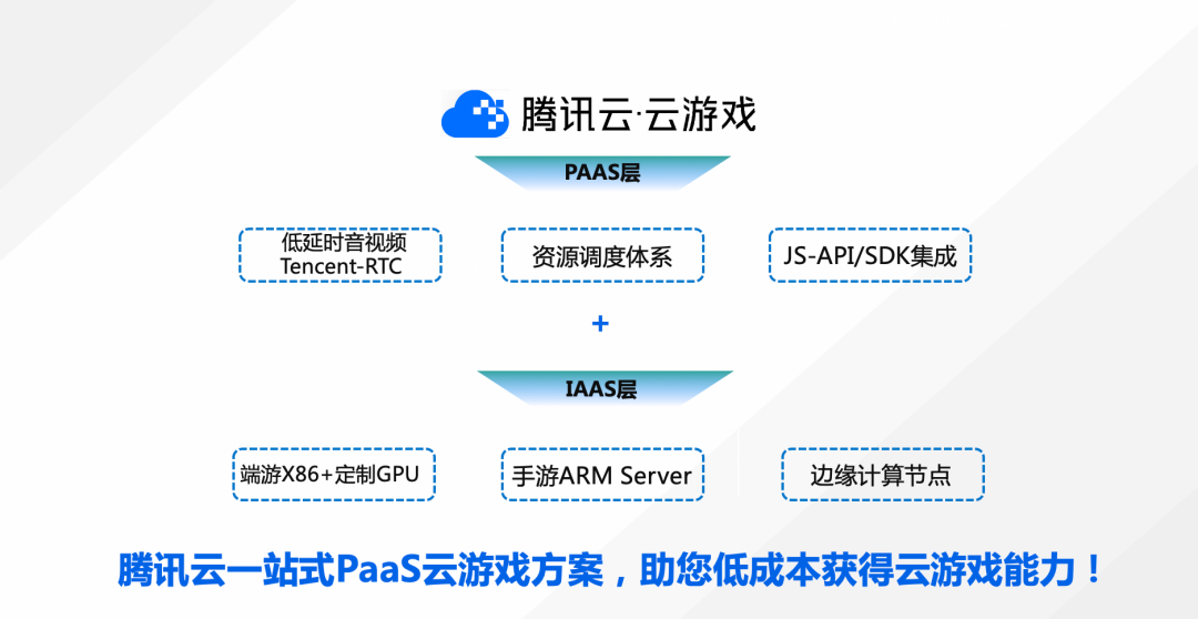 腾讯云云游戏是定位toB的技术服务提供者的角色。在技术解决方案上,腾讯云云游戏提供了一站式端游+手游云游戏解决方案,包括PAAS层(低延时音视频、资源调度系统、JS-API/SDK集成)+IAAS层(端游X86+定制GPU、手游ARM Server、边缘计算节点),助力行业打造云游戏新生态。