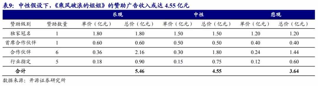 来自开源证券的相关研报认为:中性假设下,《浪姐》将为芒果超媒贡献超10亿元的收入,其中赞助广告预估为4.55亿元,会员收入则为5.52亿元。