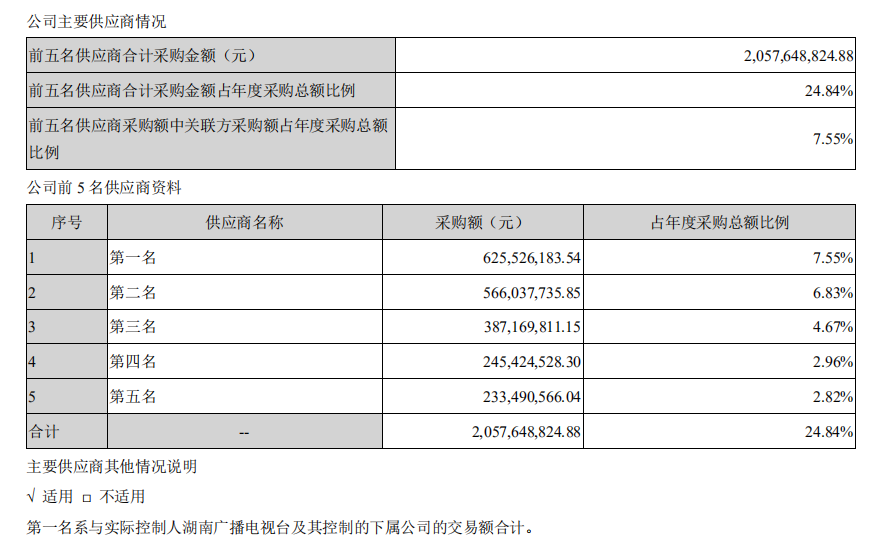 供应商方面,第一大供应企业同样也是湖南广电及下属企业。2019年全年芒果超媒向其采购金额为6.26亿元,占全年采购总额的7.55%。