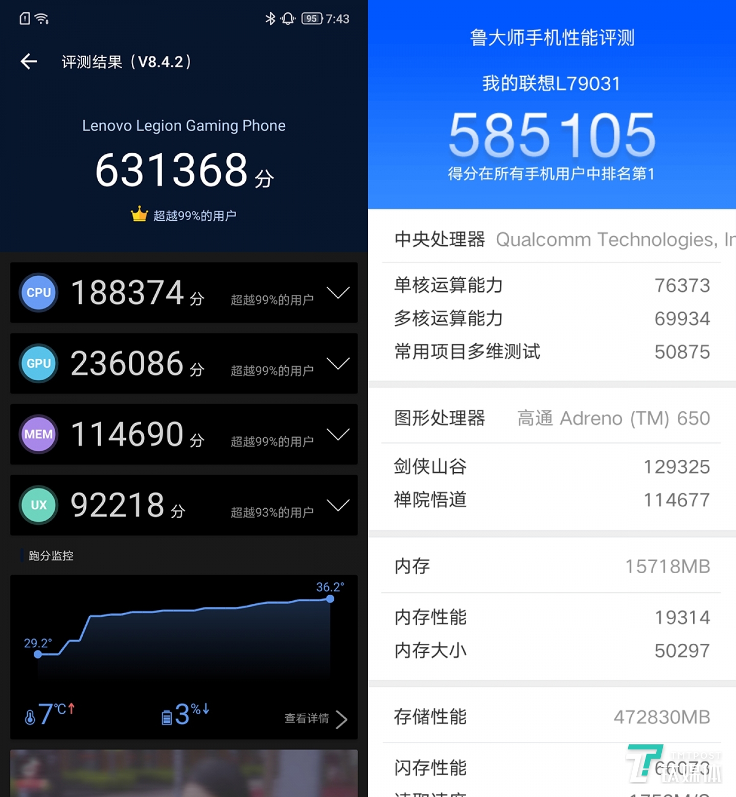 笔者用安兔兔和鲁大师两款性能测试APP对其进行了跑分测试,前者得分为63.1万,而后者跑分也为58.5万,这个得分也是目前最高水平,在跑分过程中温度的控制也比较理想。