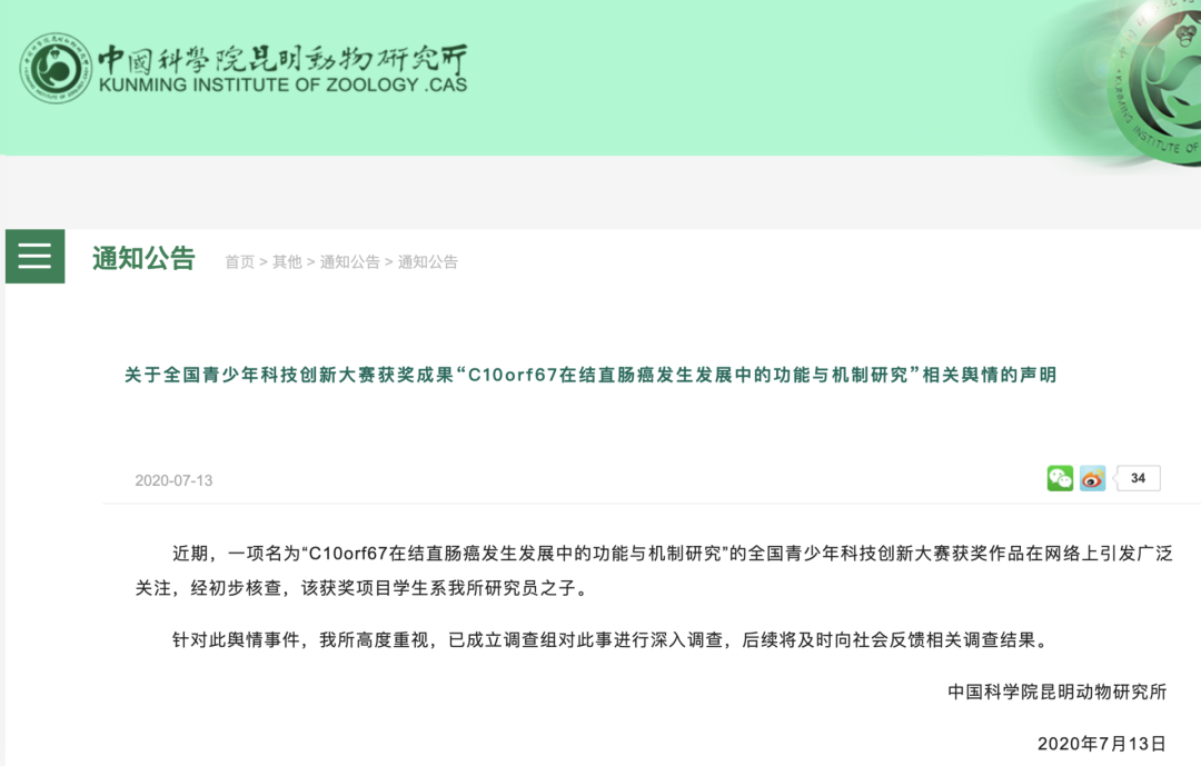对陈同学的实验,很多人质疑有人捉刀代工。7月13日,中国科学院昆明动物研究所在官网发布了公告,承认“该获奖项目学生系我所研究员之子”,并称该所“已成立调查组对此事进行深入调查”。