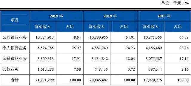 收入方面,2017-2019年上海农商行分别实现营业收入179.21亿元、201.45亿元和212.71亿元,年均复合增长率为8.95%。其中,公司业务收入比重各年分别为57.32%、54.01%和48.54%。