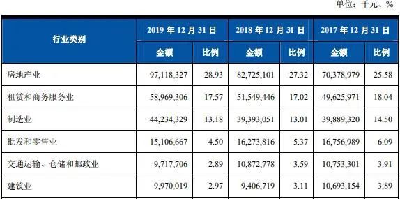 该行企业贷款和垫款客户主要集中在房地产业、租赁和商务服务业、制造业、批发和零售业及建筑业。截至2019年末,该行向上述行业客户发放贷款总额分别占全行企业贷款和垫款总额的28.93%、17.57%、13.18%、4.50%和2.97%。