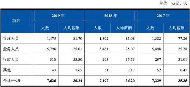 截至2019年末,全行有7626位员工,人均薪酬为36.24万元。不过,各类岗位待遇差别较大,管理人员人均薪酬是业务人员的3倍多。