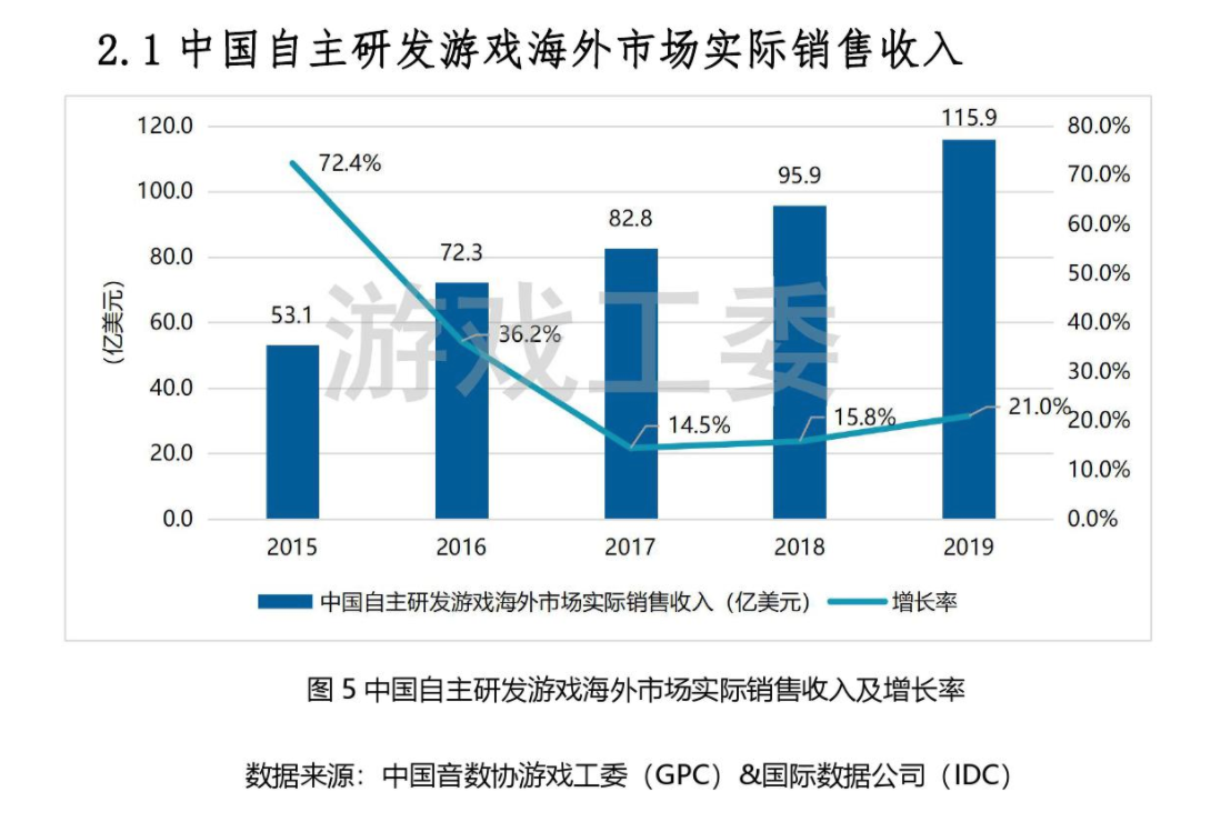 《2019年中国游戏产业报告》显示,2019年国内自主研发的游戏在国内市场实际销售收入达到1895.1亿元,同比增长15.3%;而在海外市场,各游戏公司的实际销售收入总计达到115.9亿美元,增幅21%。海外市场的规模虽然不及国内市场,但增速却令人艳羡。