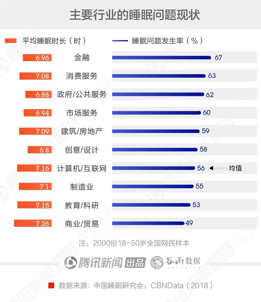 CBNData与中国睡眠研究会在2018年的调研显示,金融行业的睡眠问题发生率为67%,其次为消费服务、政府/公共服务、市场服务等领域。即,金融人、公务员、销售等职业更容易"睡不好"。
