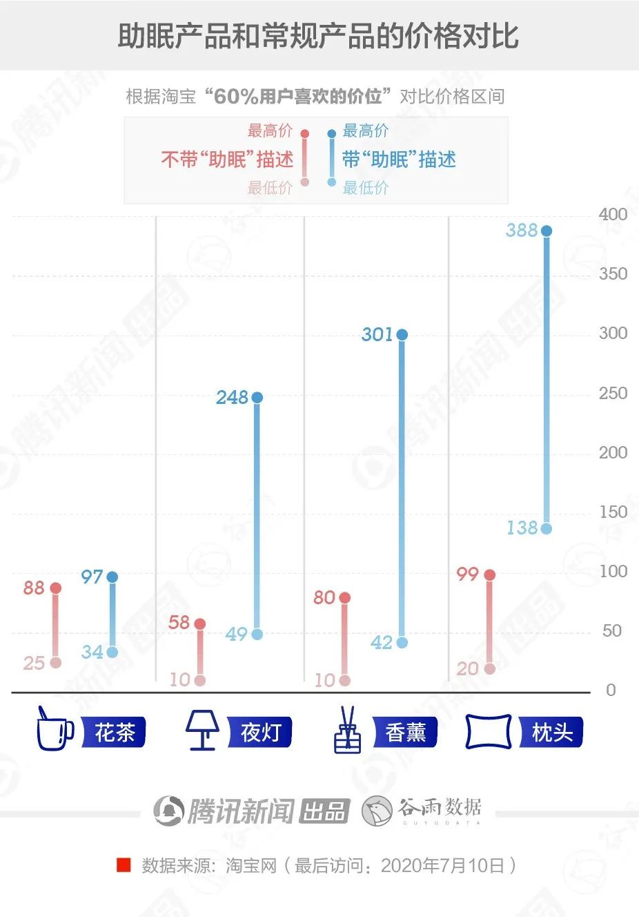 以枕头为例。一个普通枕头的主流售价在20-99元间,助眠枕头则高达138-388元,最低价高于前者的最高价。