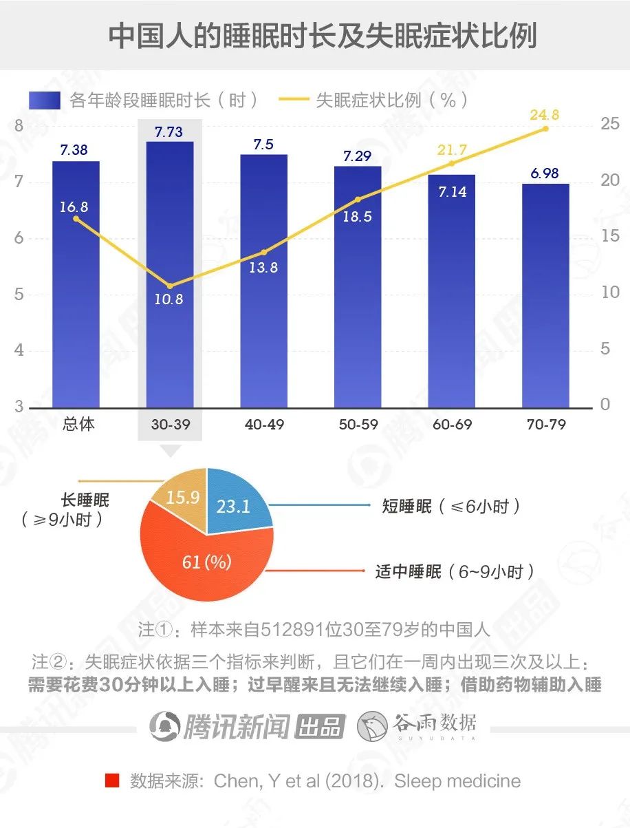 从整体数值来看,这是一个很高的比例,但不同年龄段的差别其实很明显。《睡眠医学》上的结果显示,失眠症状的比例会随着年龄段一同上升。在所调研的年轻群体中(30-39岁),失眠症状比例为10.8%,平均睡眠时长达到7.73小时。其中,有约23.1%的人为短睡眠,即每日时长不足6小时。