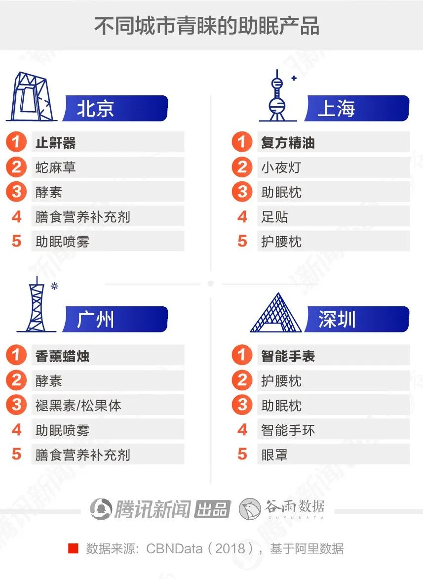 有趣的是,谷雨数据发现不同地区青睐的产品也有差异。北京、广州的消费者认可酵素、膳食营养补充剂与助眠喷雾等口服/外用的产品。上海和深圳消费者则注意到枕头的重要性。