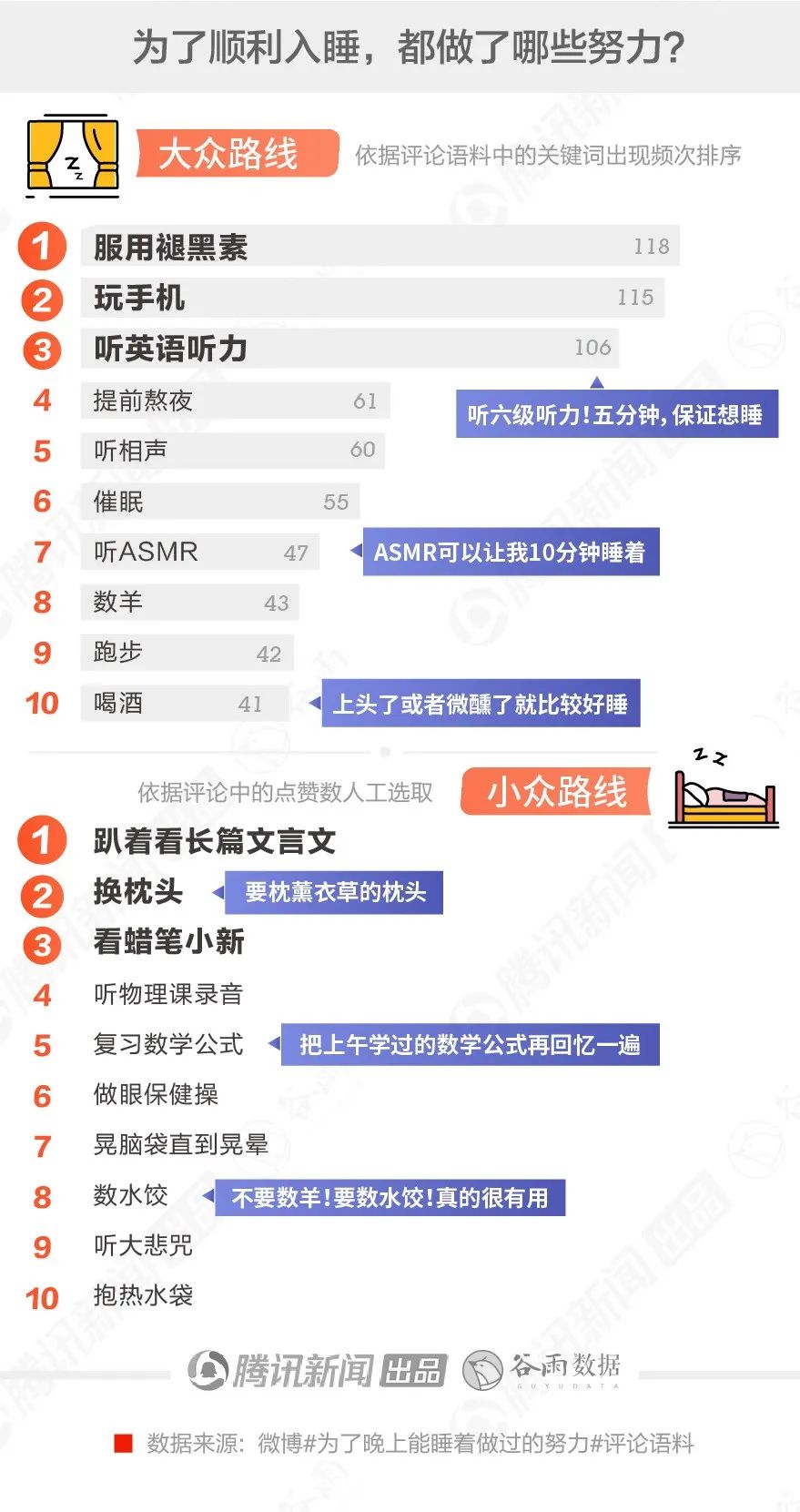 因此,为了保证睡个好觉,年轻人很拼。谷雨数据整理了微博#为了晚上能睡着做过的努力#中的数千条睡前方法,可分为大众路线和小众路线两类。