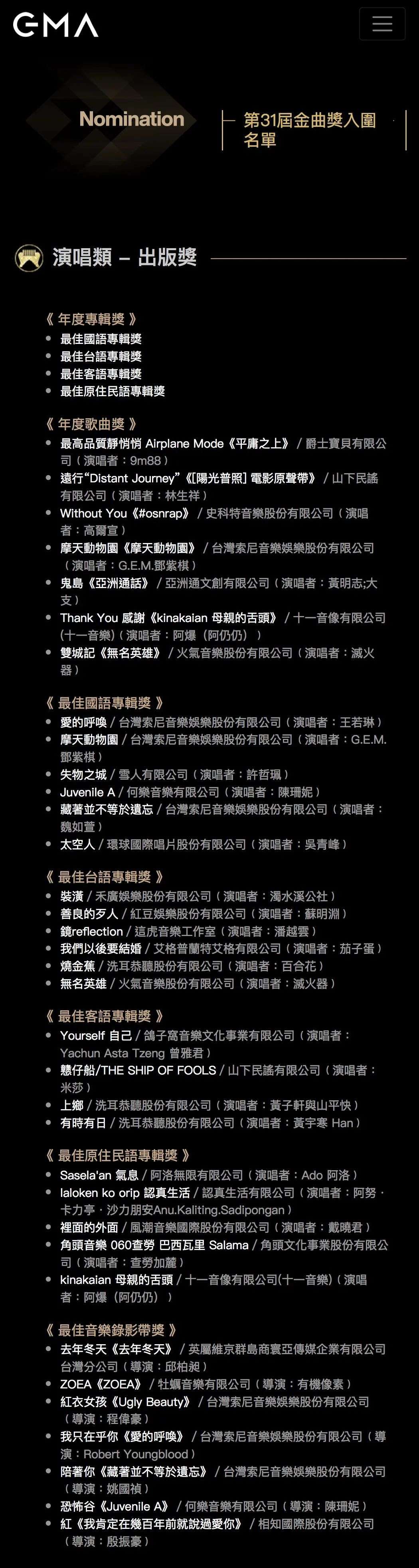 年度歌曲奖的入围则可能会让普通音乐爱好者有些脸盲。入围名单包括:《最高品质静悄悄 Airplane Mode》﹙演唱者:9m88,出自专辑《平庸之上》﹚、《远行"Distant Journey"》(演唱者:林生祥,出自《阳光普照》电影原声带)、《Without You 》﹙演唱者:高尔宣,出自专辑《osnrap》﹚、《摩天动物园》﹙演唱者:G.E.M邓紫棋,出自专辑《摩天动物园》﹚、《鬼岛》(演唱者:黄明志&大支,出自专辑《亚洲通话》)、《Thank You 感谢﹙演唱者:阿爆(阿仍仍),出自专辑《kinakaian 母亲的舌头》﹚、XXX(XXX),这里面除了邓紫棋、林生祥、黄明志有一定知名度,估计其他几位对于路人来说都是绝对的新面孔。
