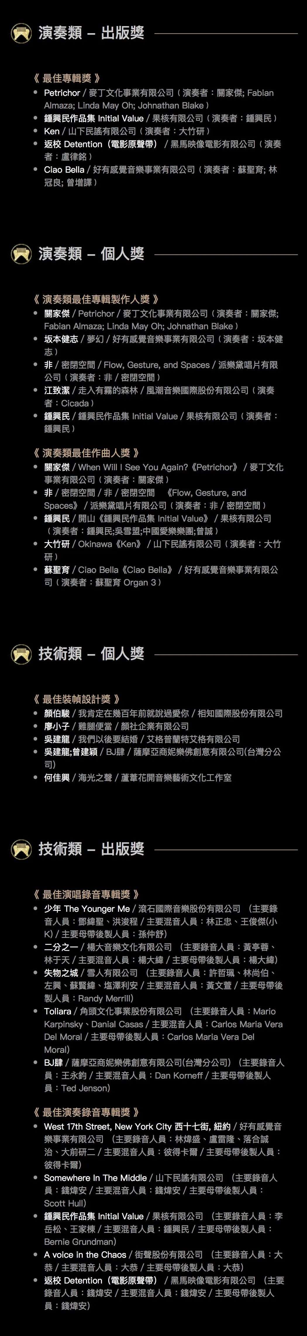 据了解,本届金曲奖共有来自231家公司的1346张专辑、EP,共19461首作品参赛,经83名评审委员以初审、资格审及复审等三阶段评审后,选出入围名单,共163首作品角逐27个奖项。