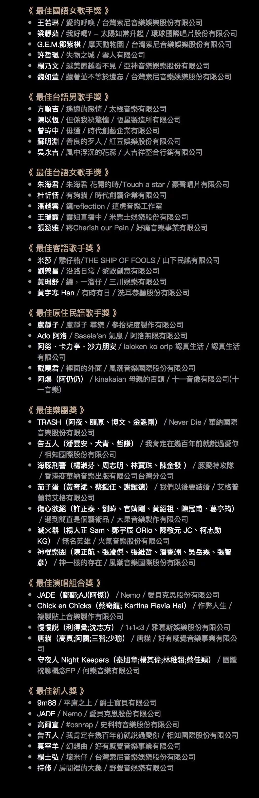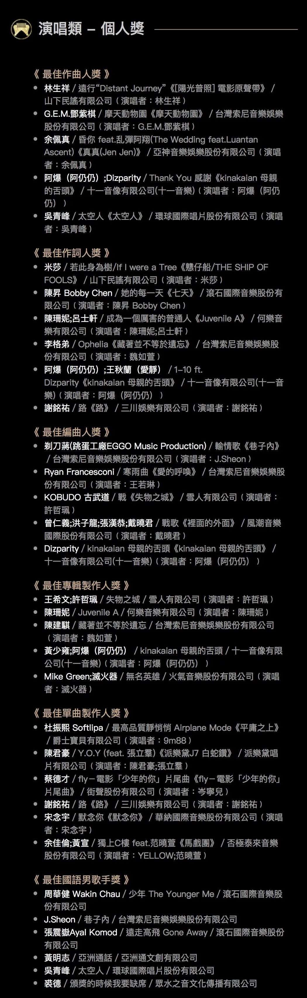 至少,去年入围年度歌曲奖的歌手和歌名,大家都至少都听过,今年真的难度有点大,越玩越小众了,这对于金曲奖自身的传播也并不是好事。
