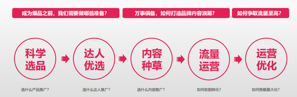 整体链路为:选品、选人、定制内容、流量运营、运营优化