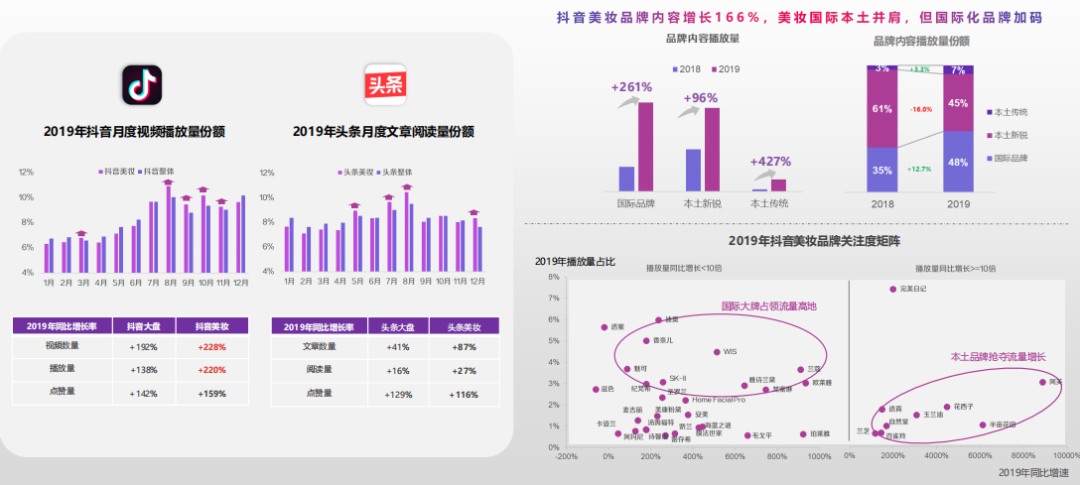 2019年美妆行业内容大幅增长,行业增速跑赢大盘,从内容到互动增势都占领上行通道,尤其抖音端内容量和关注量均呈现高倍增长的状态。