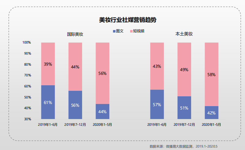 另一方面,美妆行业在社媒平台的营销偏好快速发生转移,于2020年社媒短视频的声量已超过图文,短视频成为美妆行业营销“主战场”。
