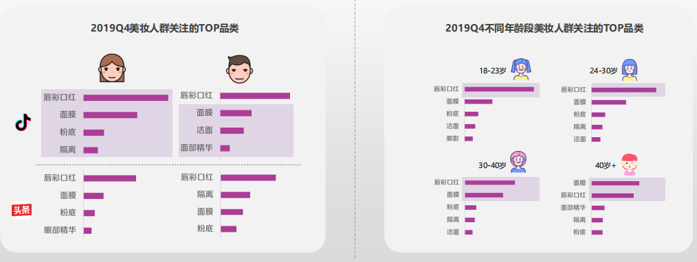 从年龄层级来看,口红因入手门槛较低,也是18-23岁群体的心头好;24- 40岁白领阶层彩妆护肤均不误;熟龄群体更注重护肤,面膜、面部精华、 眼部精华已成为他们必不可少的保养必需品。