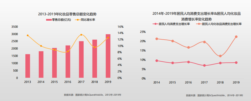 从整体消费市场来看,化妆品消费投入持续攀升,美妆行业整体繁荣,从近几年人均化妆品消费支出增速,要高于人均消费支出增长率,消费用户在化妆品的投入增加,预估仍旧会处于增长趋势,前景较为乐观。