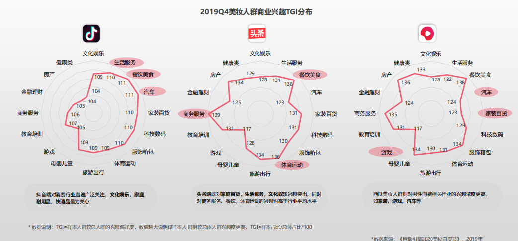 从目前数据来看,美妆用户表现出明显优于行业的高消费兴趣度,但群体差异性决定了消费兴趣的不同走向,可帮助品牌更好定位目标人群,通过精准定向实现从1到N的营销突破。