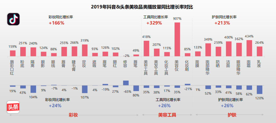 也因为内容愈发多元,行业内容开始呈现行业精细化发展得到质的飞跃,细分品类全面爆发,从传统口红、面膜等强势品类驱动过渡到新关键品类增长拉动,精华、面霜、粉底、定妆等精致品类走高。